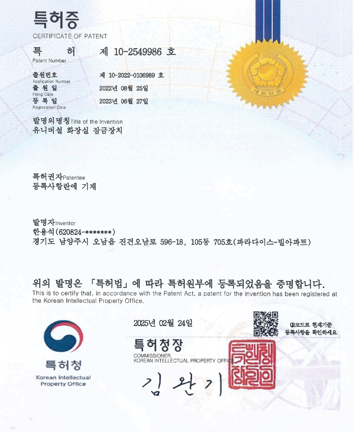 특허증 유니버설 유락 특허등록 (졔10-2549986호) 페이지 정보 댓글 0건 조회 5회 작성일 2026-04-20 19:25 본문 목록 댓글목록 댓글목록 등록된 댓글이 없습니다.